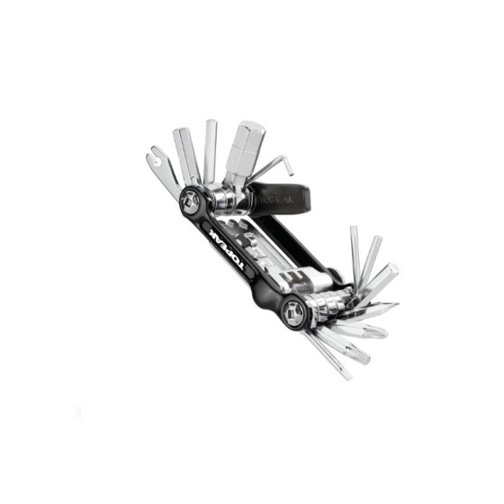 ATTREZZI:Chiavi a brugola 2-L / 2.5 / 3 (2 pz) / 4 / 5 / 6 / 8 / 10, chiavi Torx T10 / T25, chiavi raggi 14G / 15G / Mavic M7 / Shimano 4.5 mm, smagliacatena in acciaio CrMo, levagomme resistenti in alluminio anodizzato, cacciaviti #2 Phillips / testa piatta, apribottiglie con ferma raggi